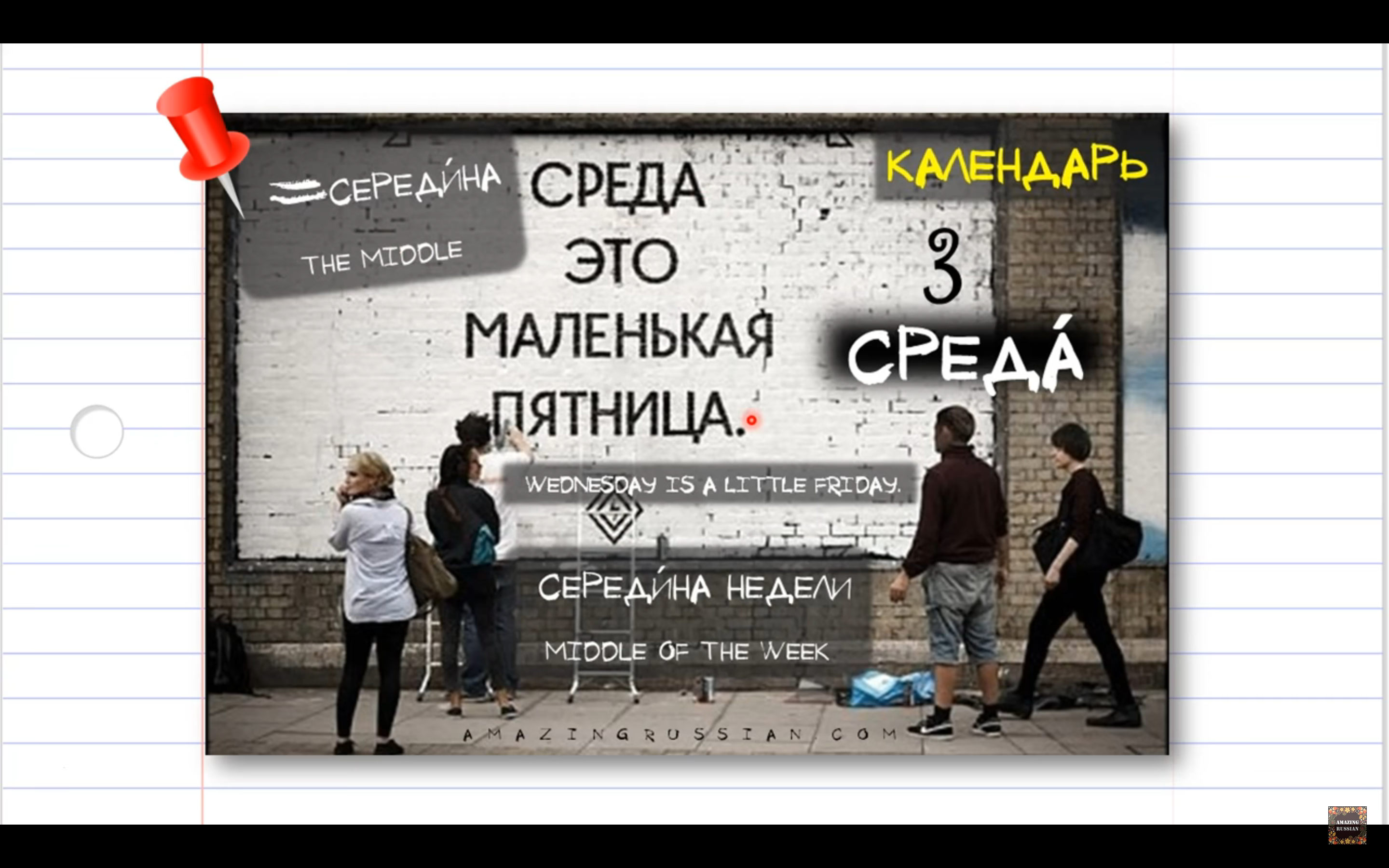 More music with days of the week: Дни недели по-русски (Easy Russian With Irene, 2020, 2 m). Days of Week Song in Russian (M O, 2016, 1 m) is set to ABBA’s “Mama Mia”; Jingle Jeff (2014, 2 m) struggled a bit with pronunciation.